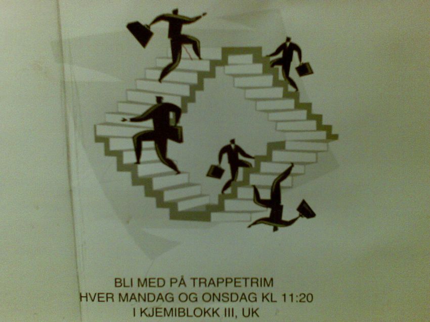 Sport ist hier ein deutlich haeufigeres Hobbie als bei den Leuten in Dtschl. Ueberall wird gejoggt, oder Ski gefahren. Parkplaetze fuer Autos gibt es an der Uni nur sehr sehr wenige (es sei denn es steht hier irgendwo ein unterirdisches Parkhaus, welches ich bisher einfach noch nicht entdeckt habe), dafuer gibt es aber um so mehr Fahrradparkplaetze (und bei den Fahrradparkplaetzen Hinweisschilder wo weitere Fahrradparkplaetze zu finden sind). Aber bewusst wurde mir dies erst gestern, als ich mal ausnahmsweise einen Fahrstuhl benutzen musste. Darin fand ich (thematisch sehr passend) naemlich den Hinweiszettel auf den zwei mal woechentlich stattfindenden Treppen-Trimm-Dich-Lauf: