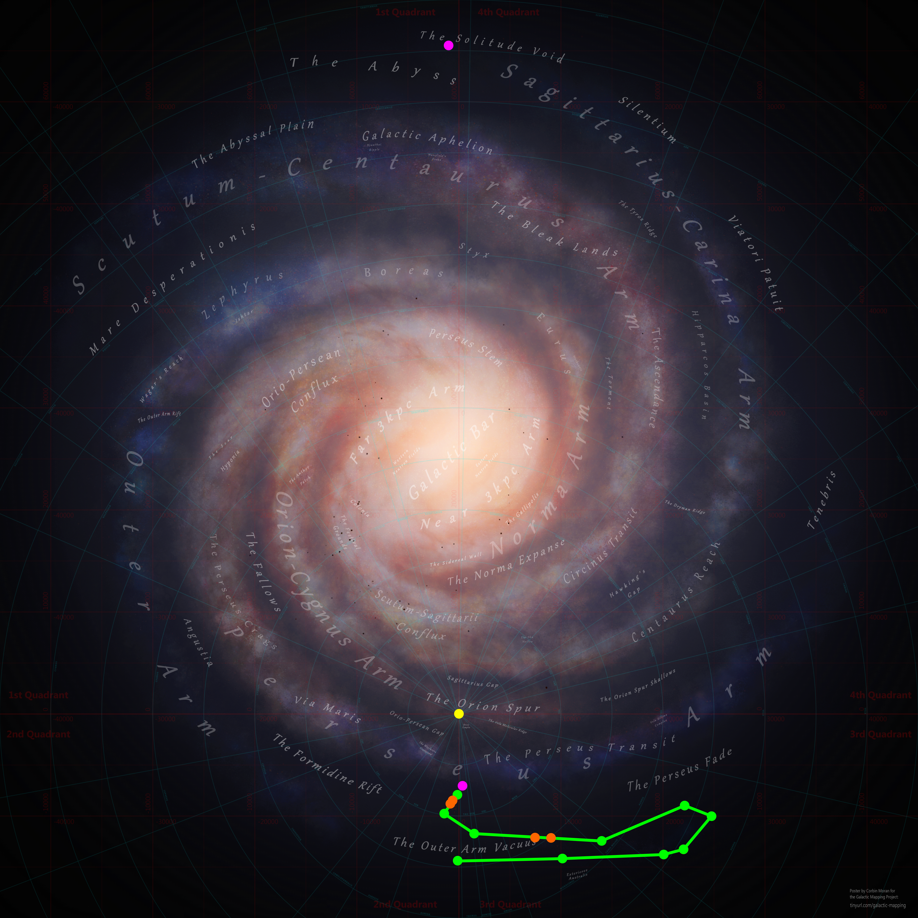 Quelle, Lizenz: unbekannt. Die galaktische (Hintergrund) Karte wurde angefertigt von CMDR Finwen und CMDR Corbin Moran, kuenstlerische Beschriftung der Regionen und Platzierung der Koordinatengitter durch CMDR Corbin Moran mit Namen vom Galactic Mapping Project. Punkte von Interesse und die ungefaehre Route meiner Expedition wurden von mir hinzu gefuegt. Ebenso ist die hier zu sehene Karte aus technischen Gruenden von mir verkleinert worden. Das Original (ohne meine Hinzufuegungen und in korrekter Grøsze) kann unter dem angegebenen Quellen-Link gefunden werden.