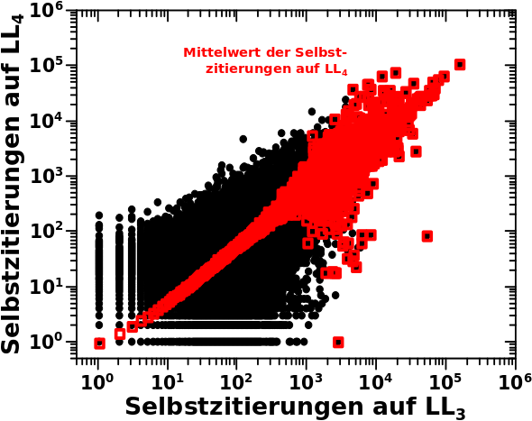 Eine Sache faellt auf: der lange „Schwanz“ der blauen Verteilung wird nicht durch die (zweite oder erste) Regressionslinie beschrieben. Das kann man fixen, ich habe das aber der Einfachheit halber nicht gemacht. Deswegen der „Abbruch“ in den roten Punkten bei 3000 Selbstreferenzen … mal schauen, wie sich das im weiteren Verhaelt.
