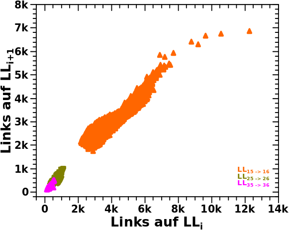Die Skala reicht natuerlich nicht so weit und die neuen Links laufen den totalen Links „voraus“. Letzteres sieht man in der linearen Darstellung an den schwarzen Punkte fuer die neuen Links von LL2 zu LL3. Diese erreichen und ueberschreiten das Maximum bereits, waehrend das bei den totalen Links von LL2 zu LL3 noch nicht der Fall ist.