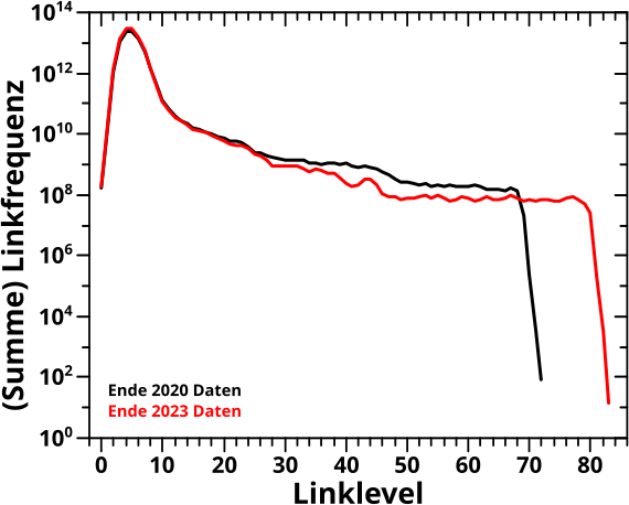 Damals hatte ich das mit der gleichen Kurve bzgl. der totalen Links verglichen. Ich denke, dass das an dieser Stelle unnøtig ist, und sei es aus dem gleichen Grund wie oben: es gibt auch hier bzgl. der Veraenderungen in den 2023 Daten nix weiter zu sagen, was nicht schon gesagt wurde.