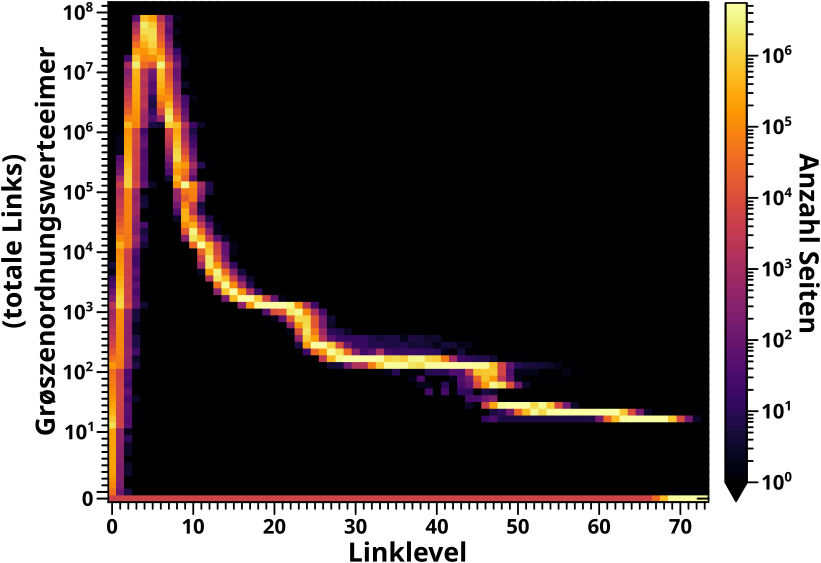 Wieauchimmer, in dem Bild sieht man das vormals beschriebene Prinzip anhand der Entwicklung der totalen Links aller Seiten (die linken Diagramme) der 2020-Daten, uebertragen auf eine Grøszenordnungsheatmap (rechte Seite).