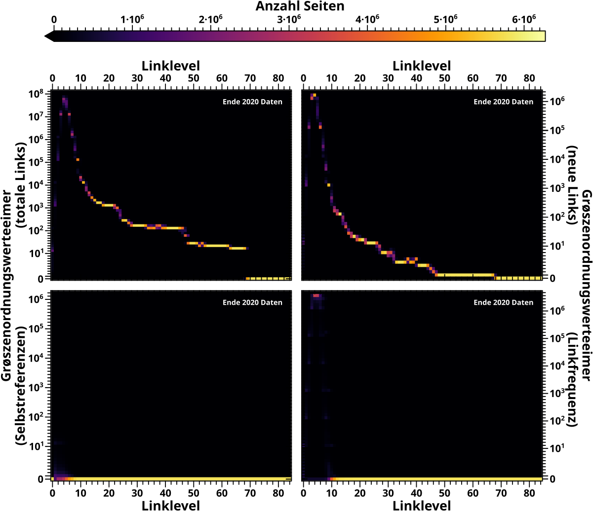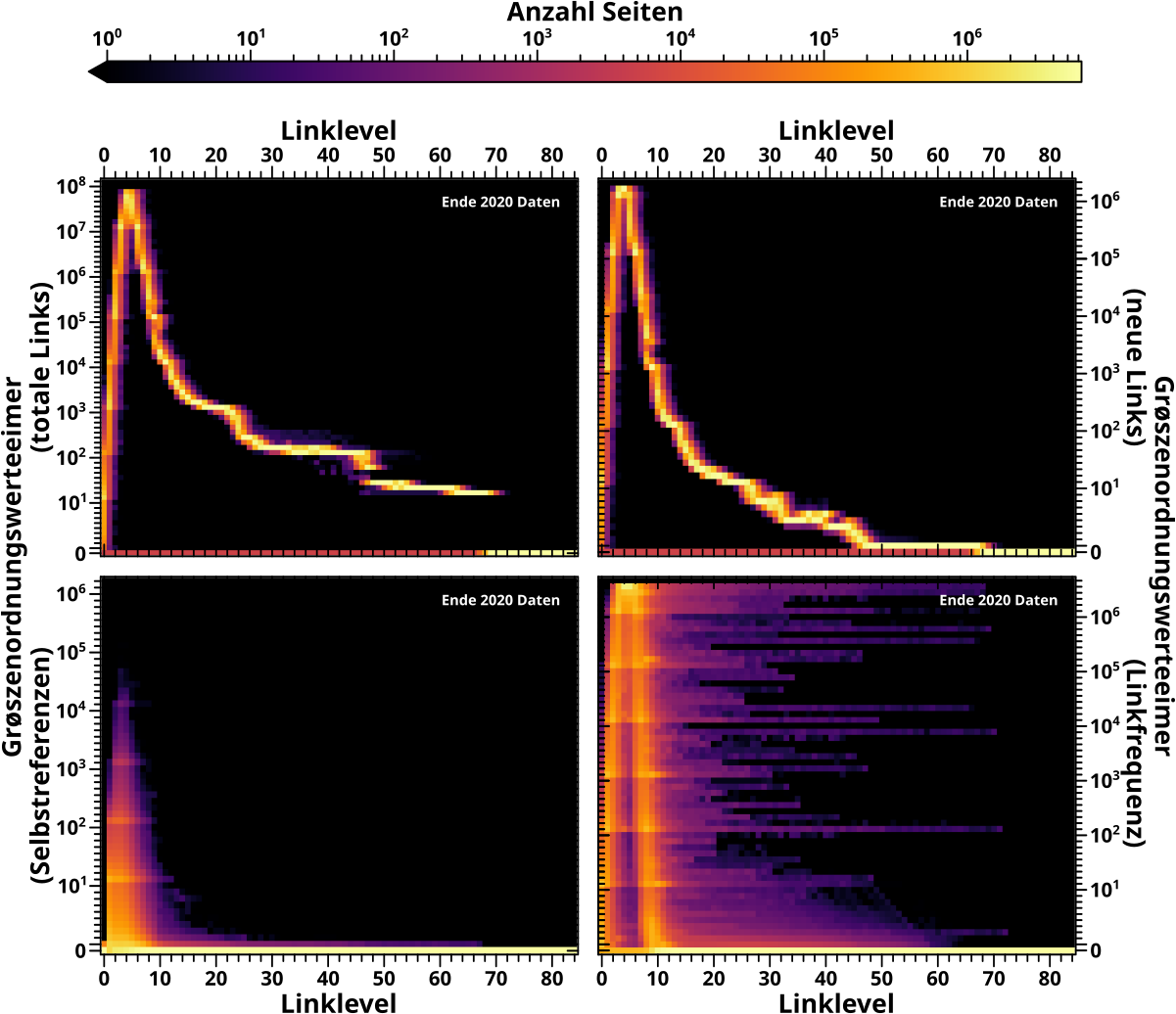 Erstens: dass sich die Verteilungen der Selbstreferenzen nach einem maechtigen Gesetz verhalten, schlaegt sich natuerlich in den Heatmaps nieder. Dies ist uebrigens einer der speziellen Faelle, in denen man die „Stufen“ durch die Komprimierung korrigieren kønnte, weil sich die Daten „gutartig“ verhalten.