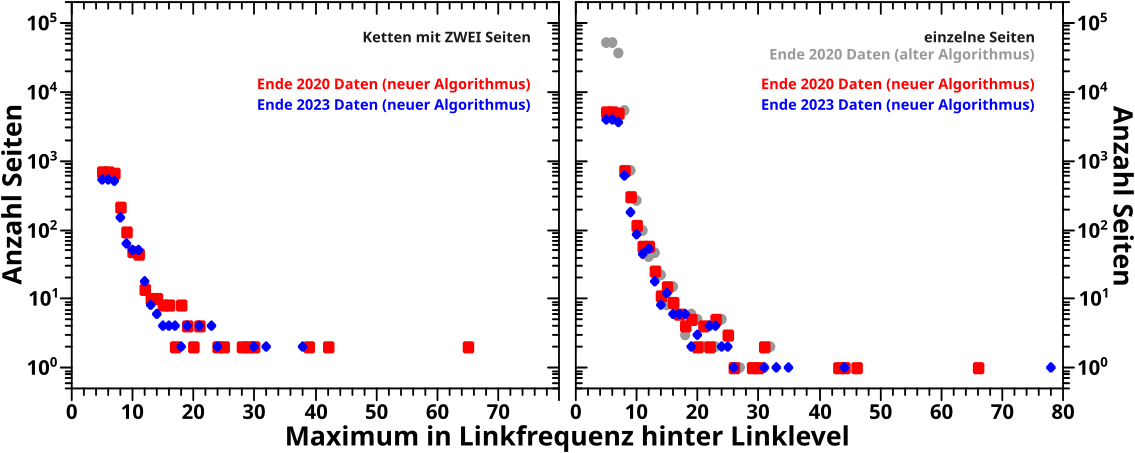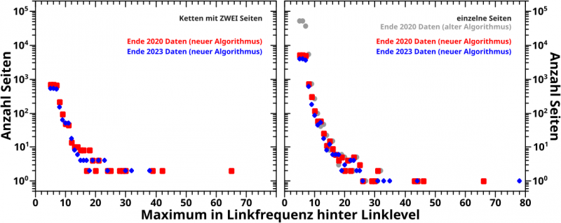 Im linken Diagramm sieht man die Anzahl der Seiten in Ketten mit zwei Seiten. Man erinnere sich, dass diese eine wichtige Rolle spielten, um beim letzten Mal Unterschiede zwischen dem alten und dem neuen Algorithmus zu erklaeren.